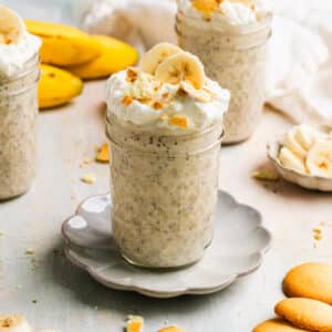 Every time I prep overnight oats for breakfast, I feel like I have my life together in the morning. It’s a mystery why I don’t prep them more often! I’m awake between 4:30 and 5am most days of the week to work out, but then it’s straight into prepping the kids’ breakfasts, packing lunches, and going to school. Sometimes it’s almost 9am before I know it and I’ve yet to eat a substantial breakfast. These banana cream pie overnight oats taste like dessert and are a breakfast I can get excited about! I prep a few jars of these at the start of the week and they’re ready when I need it. With chia seeds, Greek yogurt, and milk they are packed with a great balance of protein and carbs, but you can also add a scoop of vanilla protein powder for an extra boost! Be sure to follow my tips to give you the creamiest, dreamiest overnight oats.