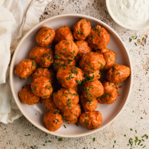 - When the meatballs are done baking, toss them in a bowl with buffalo sauce and serve topped with chives alongside raw veggies with the homemade ranch dip.