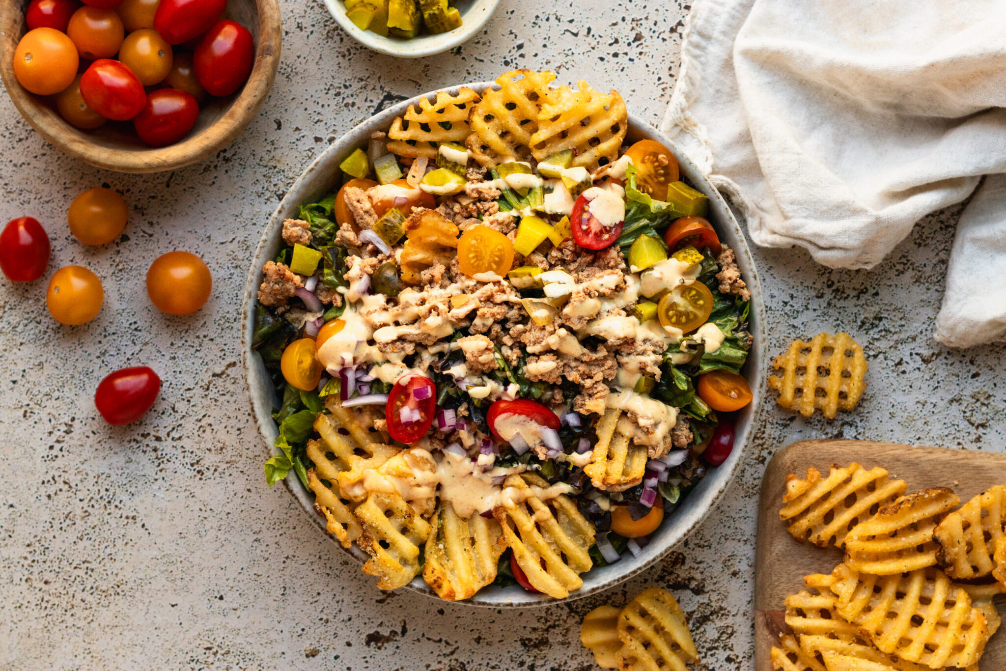 - Once the fries and meat are done, assemble your burger bowls by putting the salad in a bowl and topping with tomatoes, onions, pickles, and waffle fries. Drizzle with the burger sauce and enjoy!