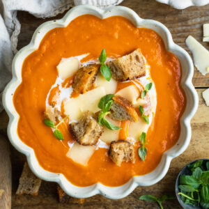 - Parmesan cheese, basil, and crotons for garnish, optional: you can always keep it simple and leave out the garnish! Serve with your favorite sandwich or artisan loaf for dipping.