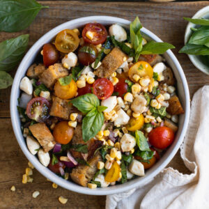- In a large bowl, add the tomatoes, corn, onion, mozzarella, and basil. Add the bread and toss to combine.